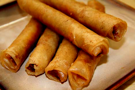 Deep fry at 350 degrees until golden brown, about 3-5 minutes. Drain on paper towels. Before serving, cut them in half. Serve with sweet sour or vinegar and garlic dipping sauce.