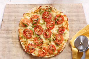 Place tortilla on baking sheet; brush with oil. Top with all remaining ingredients except basil