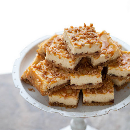 Drizzle additional caramel sauce over the cheesecake and sprinkle with additional toffee bits. Slice into squares with a large kitchen knife. Refrigerate until ready to serve.