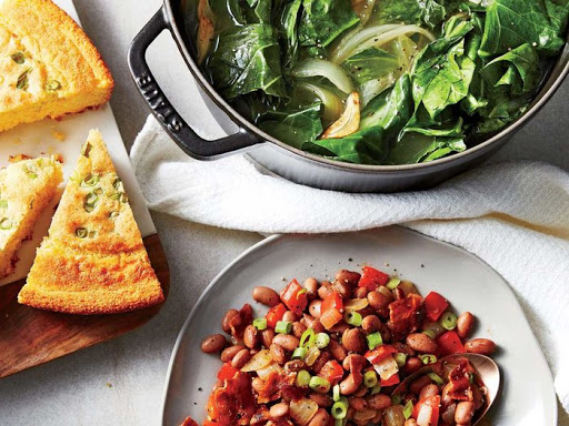 Braised Collard Greens and Bacon-Pepper Pinto Beans