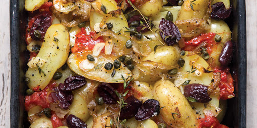Roasted Tomatoes and Potatoes With Olives and Thyme