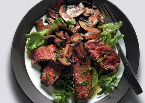 Seared Asian Steak and Mushrooms on Mixed Greens with Ginger Dressing (Bon Apetit)
