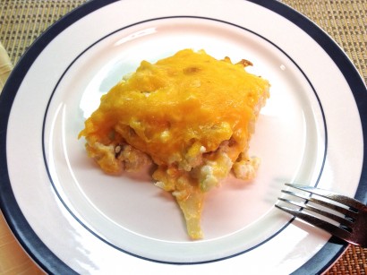 Spread evenly in a medium-sized buttered casserole dish. I used an oval baker but an 8×8 or 9×9 should be fine as well. Sprinkle a handful of additional shredded cheddar cheese over the top.