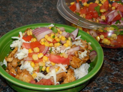 In a bowl spoon in 1/2 cup of cooked rice, a couple of spoonfuls of black beans, a few pieces of chicken and a few spoonfuls of pico de gallo salsa mixture. Top with shredded white cheddar cheese and a dollop of sour cream. Enjoy!