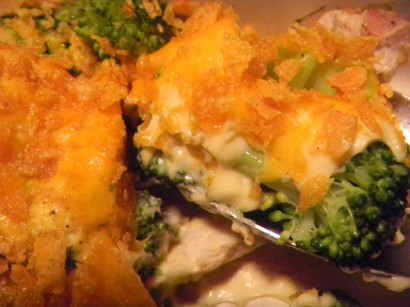 Line a large casserole dish with the cooked broccoli. Lay chicken pieces on top of the broccoli. Sprinkle with salt and pepper.