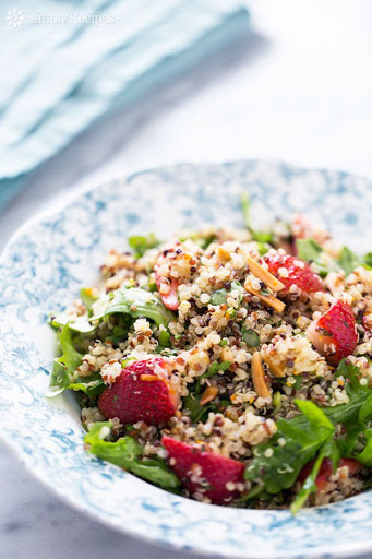 When I first encountered strawberries in a green salad years ago I didn’t quite know what to make of it. They’re red, but they’re not tomatoes, what are they doing there? One bite and I was a convert! Strawberries are juicy, tart, and sweet and make a playful addition to salads of all kinds, including a quinoa salad.