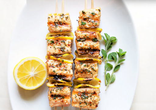 Wild salmon is cut into kabob pieces, threaded on skewers with thin slices of lemon and seasoned with a blend of oregano, red pepper flakes, cumin, sesame seeds and salt and then grilled to perfection.