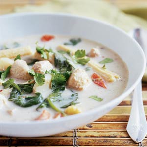 2. Pour oil into a 4- to 5-quart pan over medium-high heat. Add chicken mixture, garlic, and ginger. Stir frequently until chicken is cooked on the outside but still pink in the center (cut to test), about 3 minutes. Add coconut milk and broth and bring to a simmer. Adjust heat to maintain a simmer, cover, and cook to blend flavors, about 5 minutes.