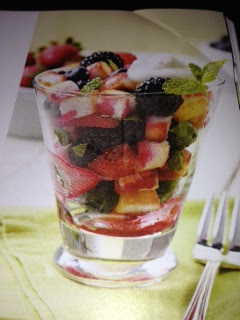Toss together cake, blueberries, blackberries, strawberry slices, mint and raspberry "juice". Top salad with a dollop of yogurt.