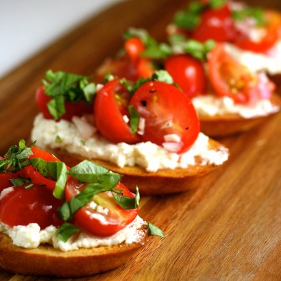 To assemble, spread some whipped feta over each toasted bread slices. Spoon the tomatoes over the crostini and sprinkle the basil over the top.