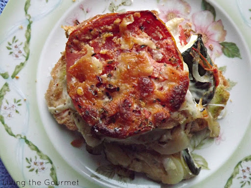 Place some slices of bread to fit the bottom of the dish. Place zucchini, onion and garlic and slices of tomato. Top with the shredded cheese and grated Romano; repeat this process until all of the bread a veggies is used.