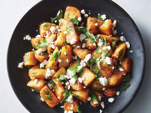 Uncover; stir in olive oil, cumin, coriander, salt, and paprika. Cook 3 minutes or until parsnips are browned and tender. Remove from heat; stir in lemon juice and parsley. Sprinkle with feta cheese.