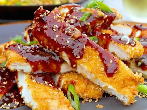 Slick a large skillet with peanut oil and set over medium-high heat. In batches, fry the chicken until golden brown and cooked through, 3 to 4 minutes per side. As you go, keep cooked chicken warm in the oven on a wire rack set over a baking sheet.