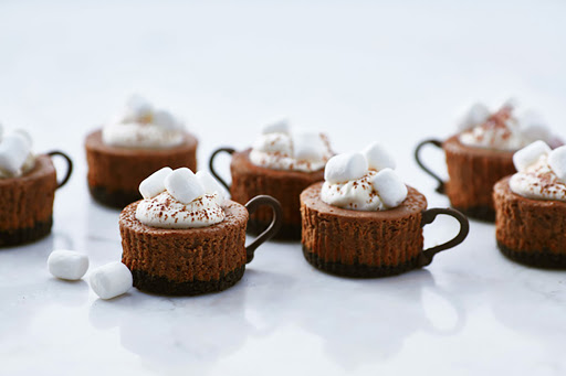 Remove liners from cheesecakes. Beat cream and remaining sugar in separate medium bowl with mixer on high speed until soft peaks form; spoon onto cheesecakes. Sprinkle with remaining cocoa powder; top with marshmallows. Gently press chocolate handle into side of each cheesecake.