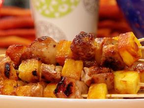 Lightly salt the pineapple. Divide the pineapple and chicken among the skewers, threading them in an alternating fashion and shaking off excess marinade from the chicken chunks. Heat a grill pan over medium-high heat until hot. Working in batch if necessary, grill the skewers, turning, for 20 minutes or until the juices run clear when the chicken is pierced with a knife.