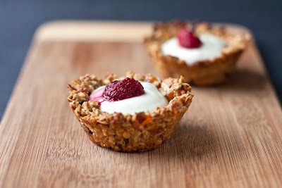 Divide mixture among 12 medium sized greased muffin cups. Using your fingers press into the center of each muffin cup and then work your way around the edges to form a granola bowl. It really helps to keep your fingers wet during this process.