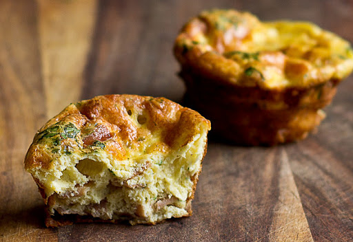 Add egg mixture to 6 muffin cups, filling each almost to the top. Bake for about 20-25 minutes, until tops are puffed and golden brown. Serve immediately or cooled. Leftovers can be stored up to a week in the fridge and reheated.