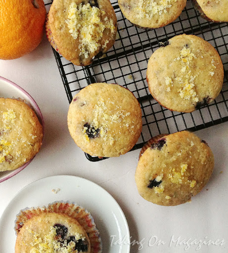 Meanwhile, stir together orange peel, lemon peel, and the 2 Tbsp. sugar. Remove muffins from oven; brush with 2 Tbsp. melted butter. Sprinkle citrus-sugar mixture on top. Cool in muffin cups on wire rack 15 minutes. Serve warm.