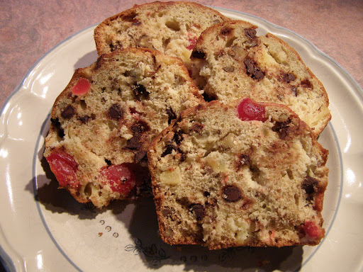 In a large bowl, cream together the shortening and sugar until light and fluffy. Add the eggs, one at a time, beating well. In a separate bowl mix the flour, baking powder, baking soda & salt. Add this dry mix to the creamed mix small batches at a time, alternately with the bananas and pineapple. Fold in chocolate chips, cherries, and nuts.