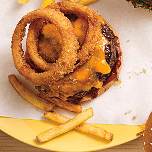 3. Spread tops and bottoms of buns with barbecue sauce. Place burgers and onion rings on buns. Serve immediately with assorted toppings, if desired.