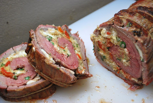 Spread l/2inch slices of meat with 1/4 inch cream cheese Sprinkle with green onions and pepper, Cover completely with smoked salmon roll up like jelly roll.