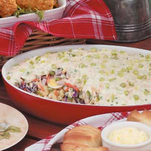 Place lettuce in a shallow 3-qt. dish; top with the green pepper, cucumber, macaroni, eggs, cabbage, red onion, carrots, ham if desired, peas and cheese.