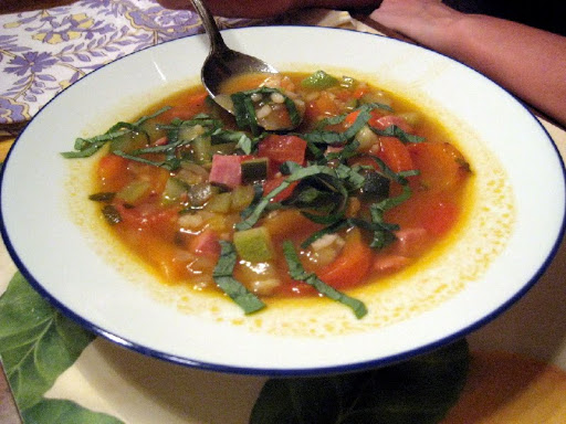 Add the hot stock and season with salt and pepper. Bring the mixture to a boil, and add the zucchini and the rice. Bring back to a boil and then lower the heat so that the liquid is simmering. Let simmer gently until the rice is cooked, about 30 minutes. Remember to stir the soup occasionally. Add more stock, if necessary.