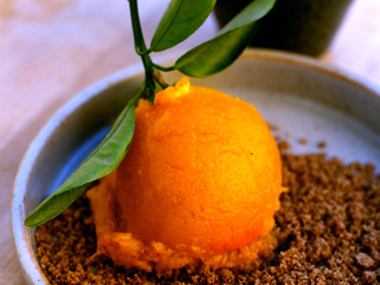 3. Use an ice cream scoop to scoop squash. Top with pecan dirt, maple syrup, and salt. Serve with a shot of warm horchata.