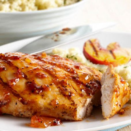 Grill peach halves 2 to 3 minutes per side or until lightly browned, brushing with reserved marinade. Serve chicken with grilled peaches.
