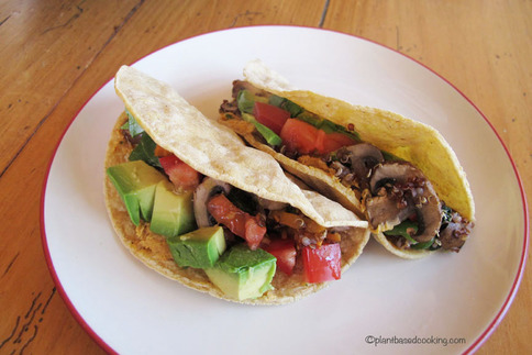 I've been on a taco kick - tacos with corn tortillas, tacos for dinner or breakfast. Yes, breakfast. And, they are a great addition if you're trying to loose a few pounds. Corn tortillas have virtually no oil. Trader Joe's brand Ingredients: stone ground corn, water, traces of lime. Can't beat that! So I'm encouraging you to experiment with your taco ingredients. I like to substitute hummus for cheese. It adds the kick and creaminess that you get from a good cheese. It's always fun to top them off with chopped tomatoes, lettuce, a little avocado, and salsa, but a few sprouts works well, too. Here's a basic recipe for veggie tacos. I added crumbled tofu for the breakfast version. Try them, I think you'll really like them. Served with a fruit for breakfast tops off the meal and makes it uber plant-based :) OH, and to heat the corn tortillas, I like to put them into the toaster oven and "toast" them until they are just crispy and still easy to fold in half.