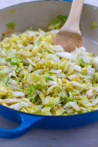 - 1 (2 lb.) head Napa cabbage, quartered lengthwise & thinly sliced