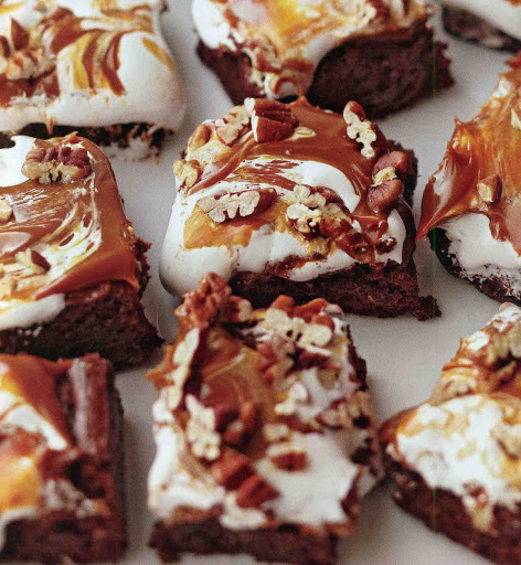 4. Remove brownies from oven and set pan on a wire rack. Immediately spoon marshmallow creme in mounds on top of hot brownies. Drop spoonfuls of dulce de leche between mounds of marshmallow creme. Let stand for a few minutes to soften. Using a table knife or narrow metal spatula,gently swirl marshmallow creme and dulce de leche together to marble.