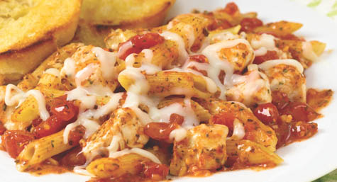 Preheat oven to 375ºF. Place pasta, chicken and 1 cup of the cheese in 13x9-inch baking dish.