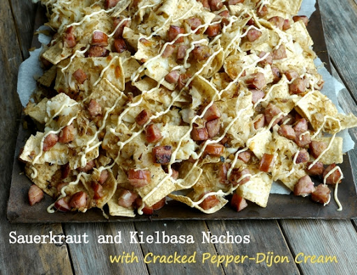 Sauerkraut and Kielbasa Nachos with Cracked Pepper-Dijon Cream