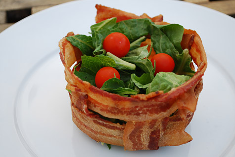Wrap the bottom of each muffin cup with approximately 6 slices of bacon intertwining each other.