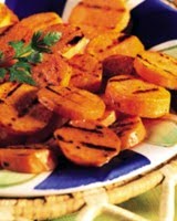 Preheat grill. Clean sweet potatoes, cutting off any bad spots. Cut into 1/2 inch slices. Place on medium hot grill and cook for about 8-10 minutes on one side. Soften butter and mix with honey. Spread mixture over slices and turn. Continue grilling about 6-8 minutes. Turn and spread on more honey butter. Continue grilling until honey butter gets all bubbly.