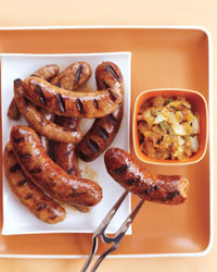 Grill the sausages over a medium-high fire until golden and cooked through, 10 to 12 minutes. Serve the sausages with the grilled-onion chowchow.