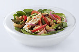 PLACE chicken and vegetables on spinach-covered platter; sprinkle with nuts.