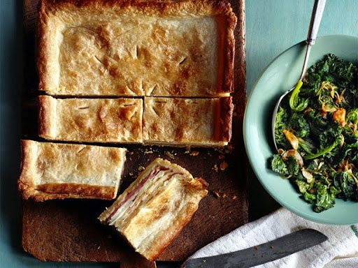 Bake until golden, 30 minutes. Reduce temp to 400, brush crust with cream, and bake 30 more minutes. let cool 20 minutes, then remove from pan and slice.