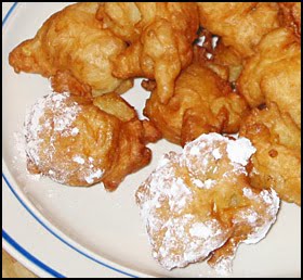 In large skillet heat remaining half cup oil over medium high heat. Dip apple slices into batter; let excess drip off. Fry about 2 minutes. turning once, until golden brown. With slotted spoon, remove to paper towels to drain. Serve warm sprinkled with confectioners sugar. makes 4 servings