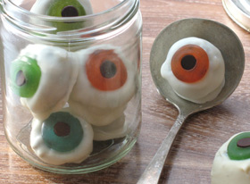 9. Allow the white chocolate coating to cool and harden before serving the eyeballs. You can speed up the process by chilling them on the tray for a few minutes. Store leftover eyeballs in an airtight container in the refrigerator. Makes a dozen or more.