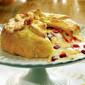 Unfold the pastry sheet on a lightly floured surface. Roll the pastry sheet into a 14-inch square. Spread the preserves on the pastry to within 2 inches of the edge. Sprinkle with the cranberries and almonds. Place the cheese in the center of the pastry. Fold the pastry up over the cheese to cover. Trim the excess pastry and press to seal. Brush the seam with the egg mixture. Place seam-side down onto a baking sheet. Decorate with the pastry scraps, if desired. Brush with the egg mixture.