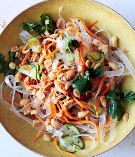 Add noodles, oil, half of cilantro, and half of peanuts to bowl; toss to combine. Top salad with remaining cilantro and peanuts.