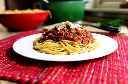 Serve a big bowl of oiled noodles and spaghetti sauce so guests can serve themselves. Top each serving with minced parsley and grated Parmesan (or Parmesan shavings) and serve with a big piece of garlic-cheese bread.