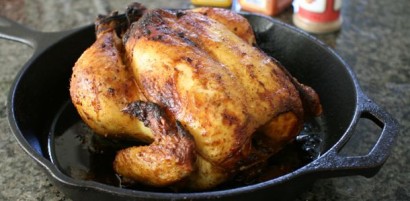 8. Lay the chicken, breast side up, in a roasting pan or cast iron skillet.