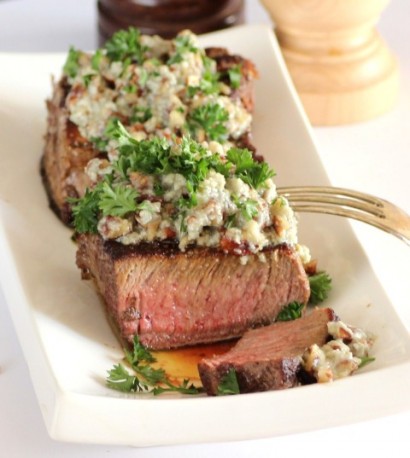 Once steaks are done, transfer the pan to the oven for 5-6 minutes, using a meat thermometer to make sure it has reached 125ºF for medium rare. Remove the steaks from the skillet and top with the cheese topping, cover with tin foil and let rest for 5 minutes. Sprinkle with the optional parsley and serve.