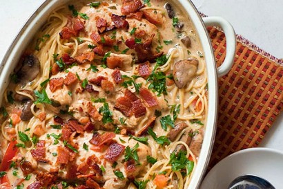 Remove chicken from the oven, stir pasta into the sauce and serve topped with crumbled bacon and more fresh parsley.
