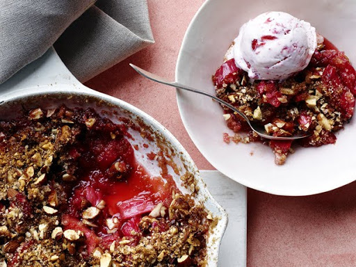 Preheat a grill to medium low. Whisk the panko, brown sugar, 1/4 cup granulated sugar, the cinnamon, allspice, ginger and cloves in a medium bowl until combined. In another bowl, toss the rhubarb with the remaining 2/3 cup granulated sugar and the lemon juice to coat.