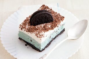 FREEZE 3 hours. Remove from freezer 15 min. before serving. Let stand at room temperature to soften slightly. Lift dessert from pan with foil handles; cut into 16 squares. Cut remaining cookies in half; place 1 on each square.