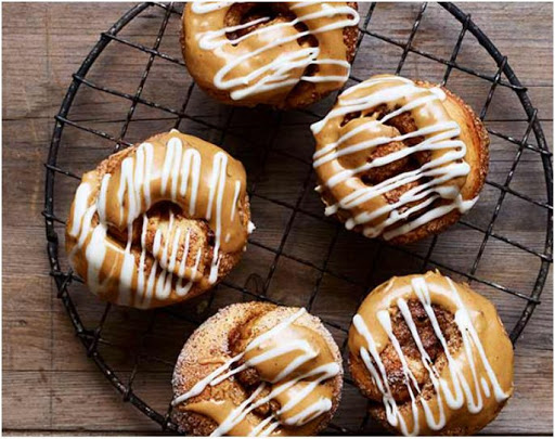 Remove the knots from the pan and dip the tops in the espresso glaze; let set 5 minutes. Snip a small corner of the bag with the white glaze and pipe over the knots.